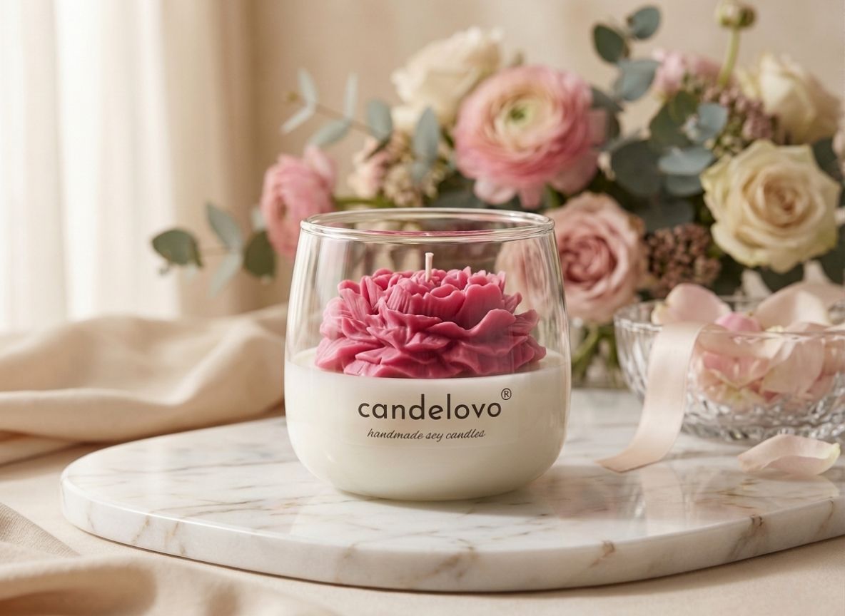 Świeca w szkle z wosku sojowego z elementem dekoracyjnym w kształcie piwonii. Nie zawiera kompozycji zapachowej, dzięki czemu nie przytłacza i sprawdzi się u osób z alergią oraz wrażliwych na zapachy.